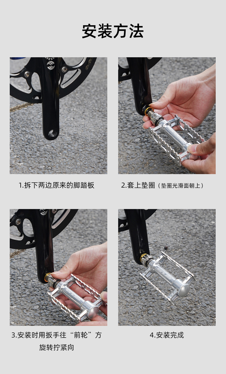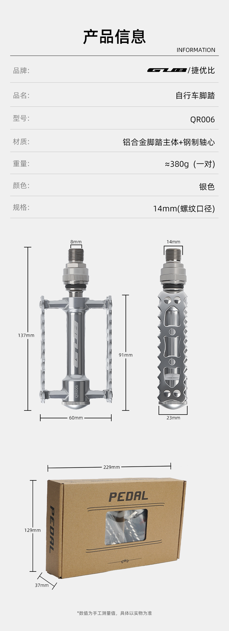 重量:双快拆净重约380克/对,毛重约456克 ;左快拆右螺纹脚踏净重约340克/对,毛重约438克