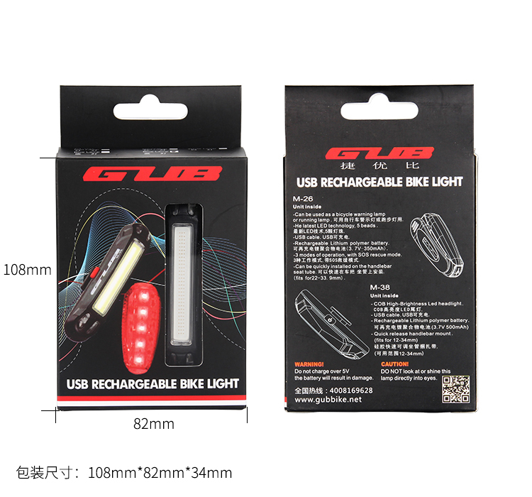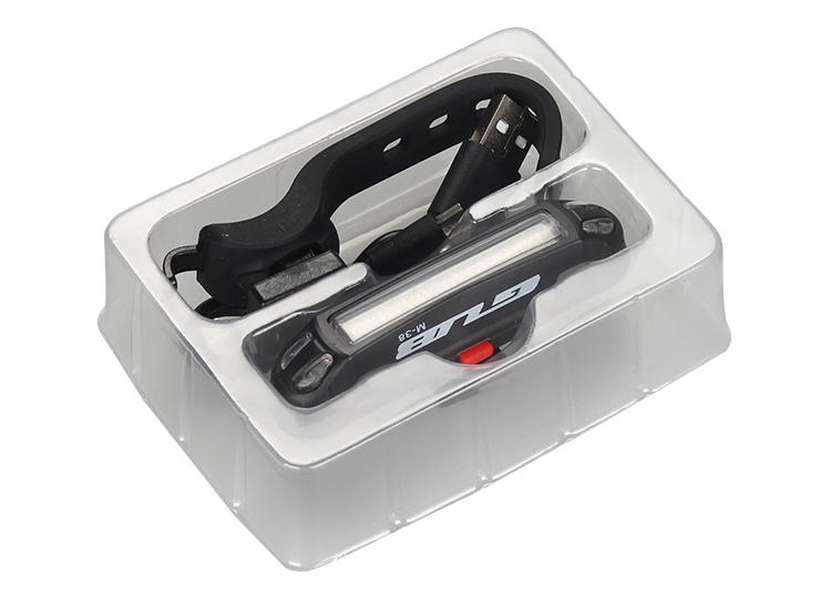 特性:LED技术,COB整面发光30颗灯珠,高亮100流明设计;配备USB接口,可循环充电;六种模式可循环切换;电池自动保护功能,电压低于2.8V不工作;硅胶捆扎固定方式,120度方位调整,方便拆卸安装;方型背扣设计,可横向和纵向不同角度安装;可安装在坐管,下叉,车把手,前叉等。