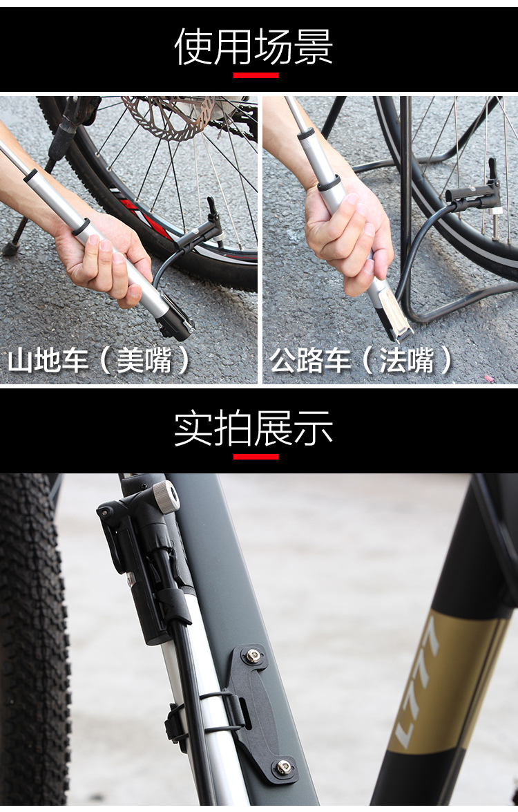 特点:铝合金气缸,体积小不占地方,美嘴法嘴兼用,带固定支架可安装在车架上