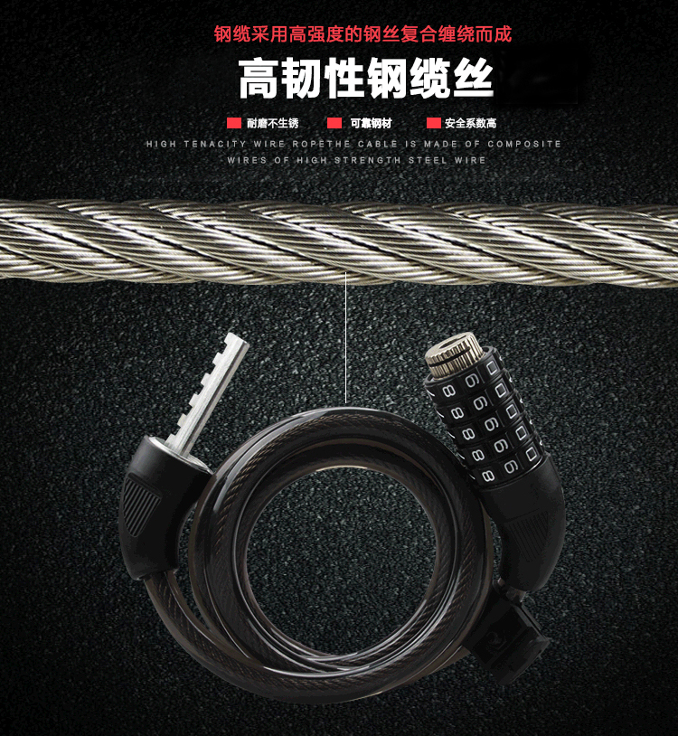 特色:五位数密码锁,时尚便捷免钥匙,1.2米合金钢缆想怎么锁就怎么锁,铝合金锁芯更牢固,带锁架方便使用