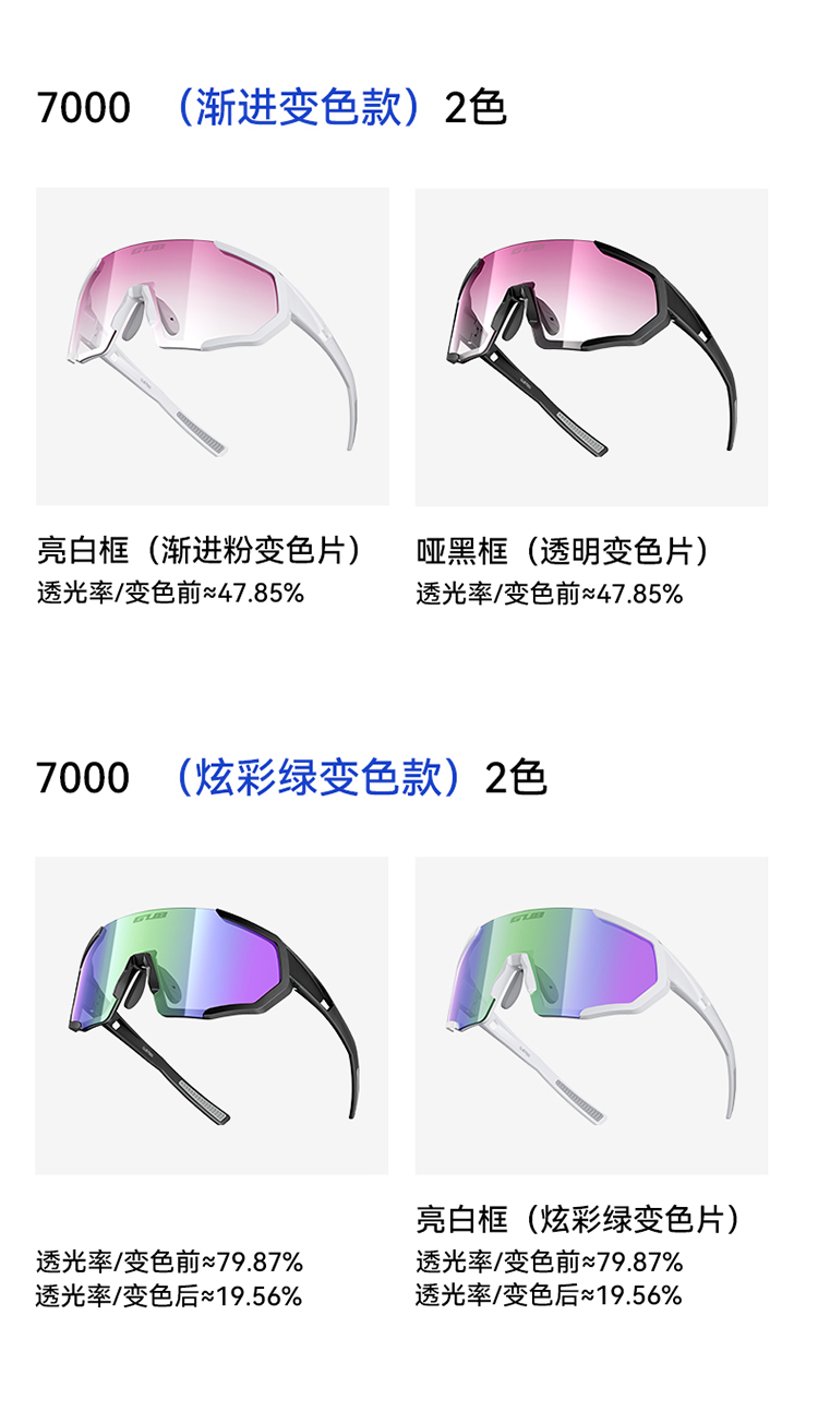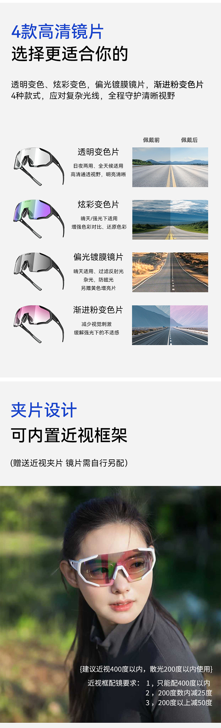 颜色:哑黑/透明变色片、亮白/透明变色片、樱花粉/透明变色片、消光灰银/透明变色片、透砂白/透明变色片、水晶灰/透明变色片、哑黑/星空银偏光片、亮白/星空银偏光片、亮白/渐进粉变色片、亮白/渐进蓝变色片、哑黑/渐进粉变色片