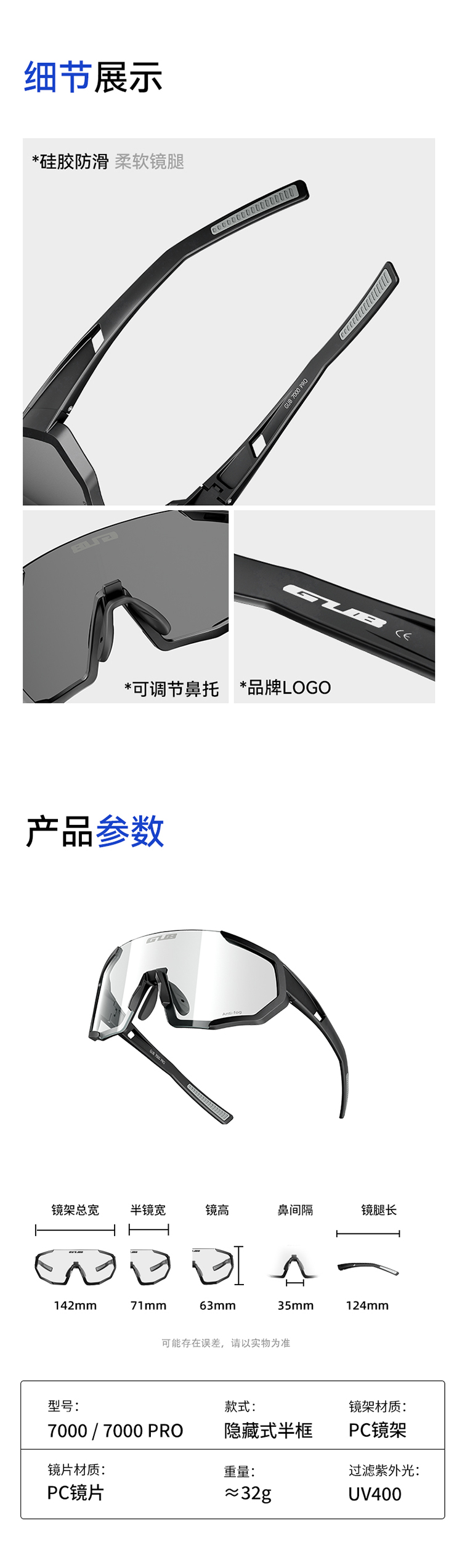 材质:PC镜框和镜脚、PC镜片、TPE鼻托