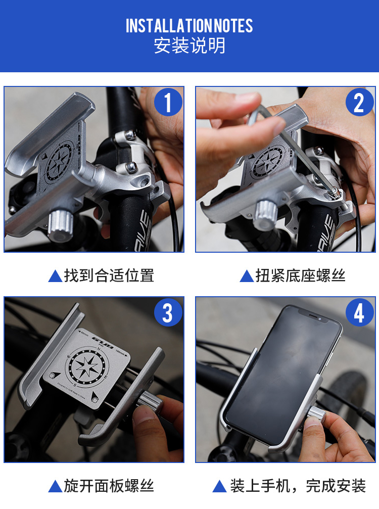 特点:全铝合金架体,加厚加宽使用更安全。免工具平面360度旋转,高兼容性不挑手机型号,自行车、电动车等都可使用!