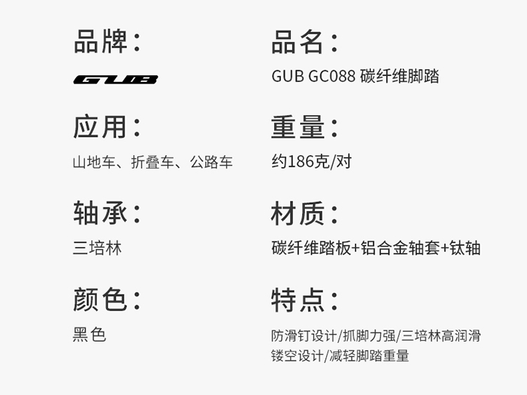 材质:碳纤维踏板+铝合金轴套+钛合金轴芯