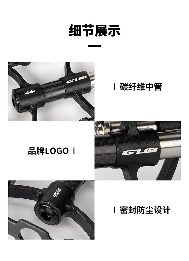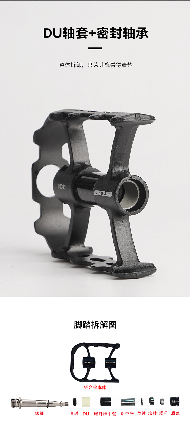 材质:铝合金脚踏主体+碳纤维中管+钛合金轴芯