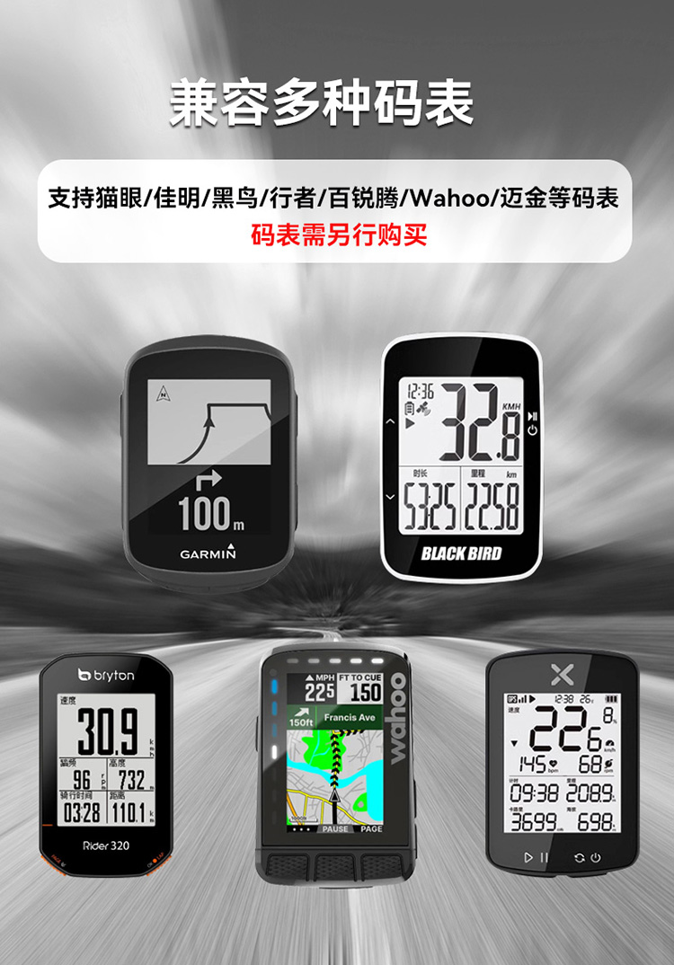 支持码表:GARMIN全系列(兼用行者/黑鸟/iGPS等),猫眼全系列,WAHOO系列,百锐腾系列,迈金系列